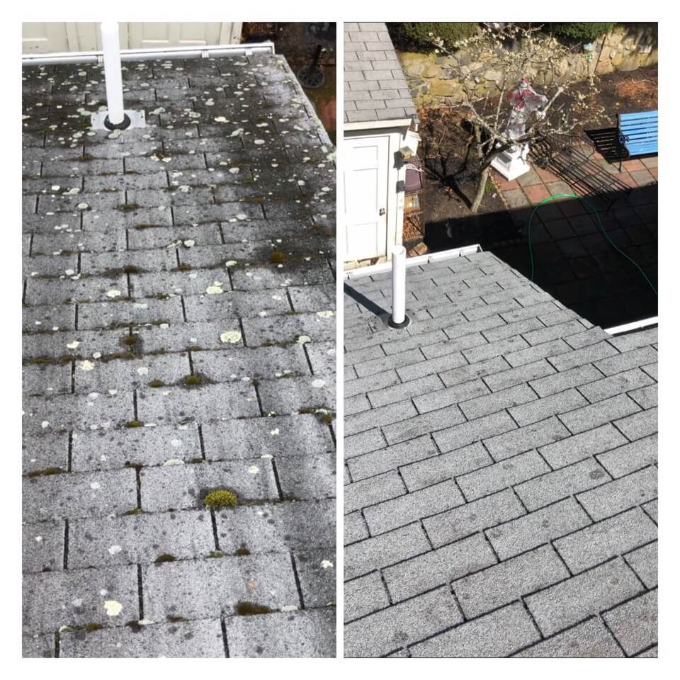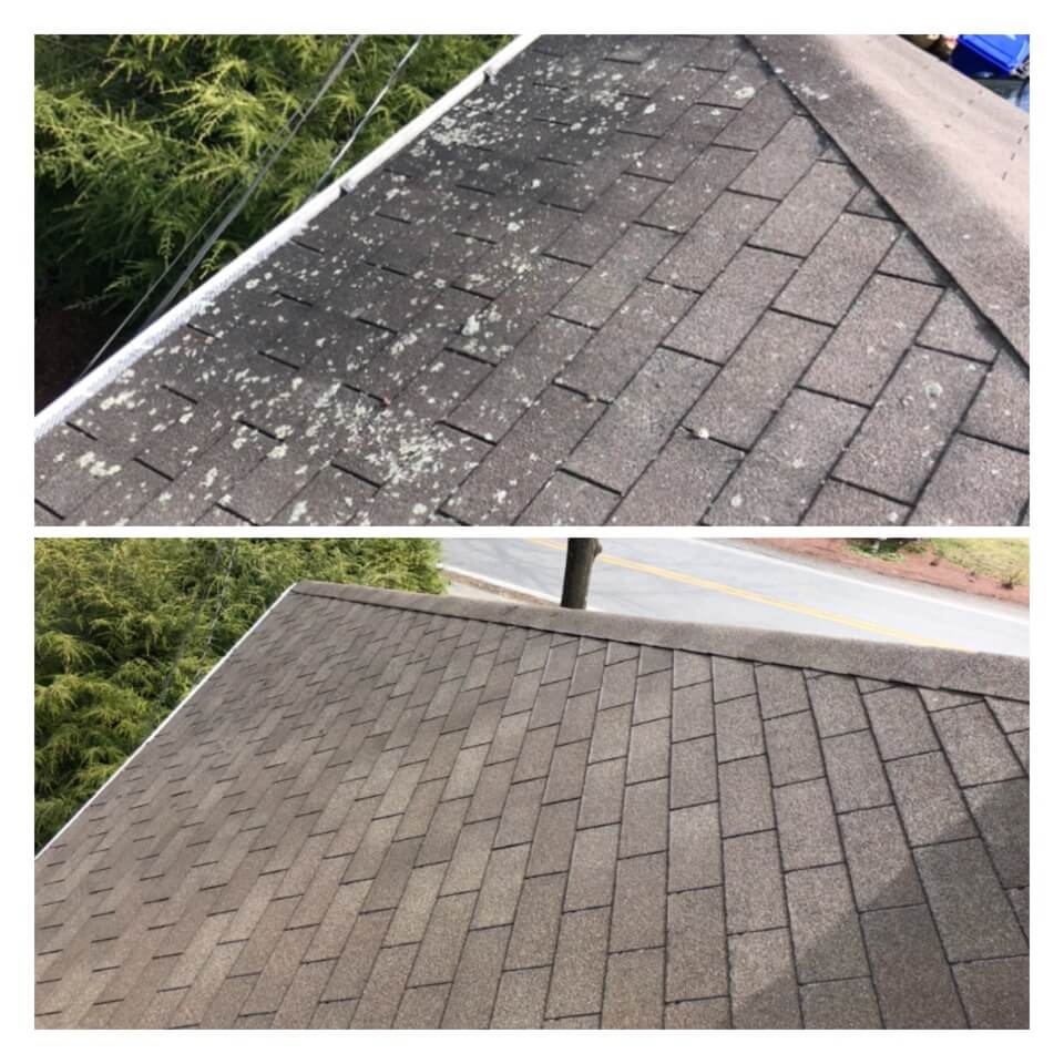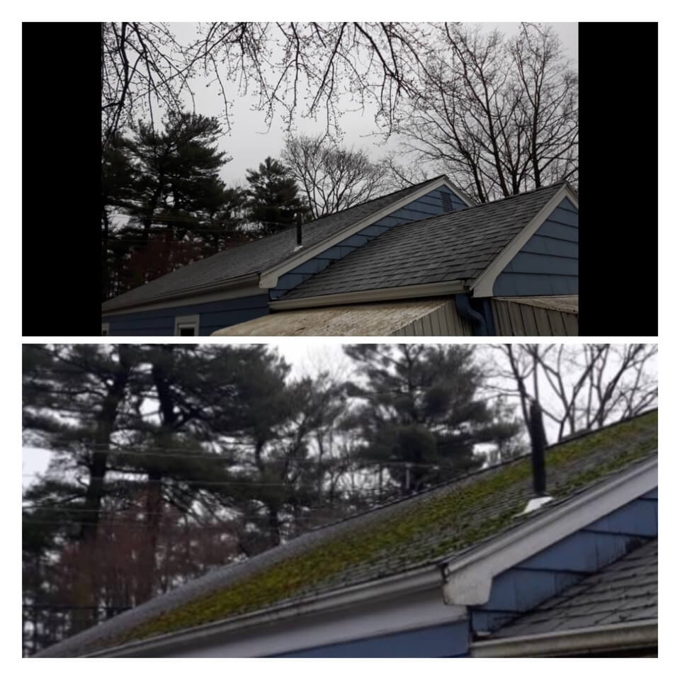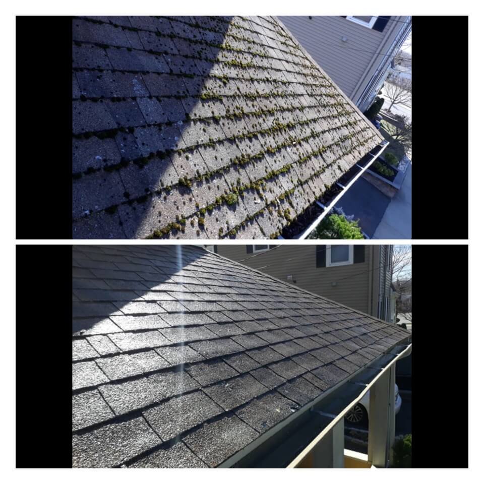 HiCleaners is the most experienced company in Bellingham, MA that deals with roof washing and roof soft washing. All of our employees are trained to recognize precise solution mixing ratios to provide you with the safest and most effective soft washing service. Roofs are a commonly neglected part of a house due to the fact that most people don’t have ladders to access it, so it is very easy to just leave it alone and forget about problems that may start to arise. Just like many home owners, discoloration and small bits of moss on a roof can be overlooked because of the misconception that it is just aesthetic. However, it isn’t just aesthetic, the moss slowly lifts the granules off the shingles which in turn shorten the life of the shingle. The moss also spreads, just like any bacteria if it is left alone for too long, it can quickly become a problem that spirals out of control. Call HiCleaners for a free quote, we only use the most advanced eco-friendly solutions and equipment to make sure the job is done right, for the safety of the employees, your plants, grass, pets, and children.