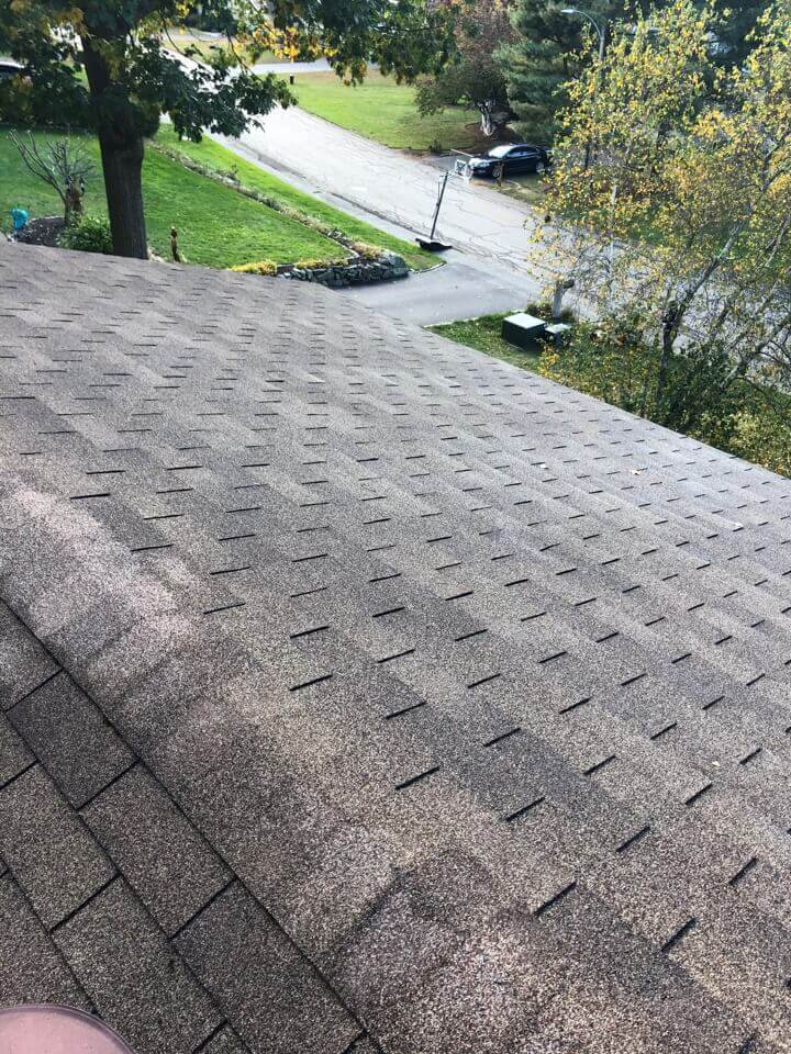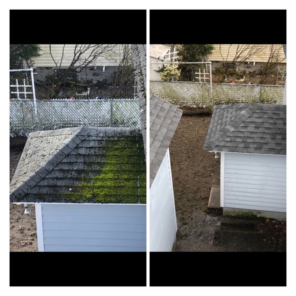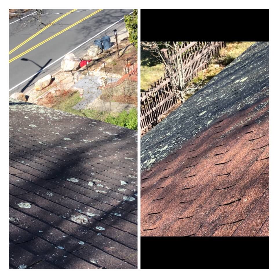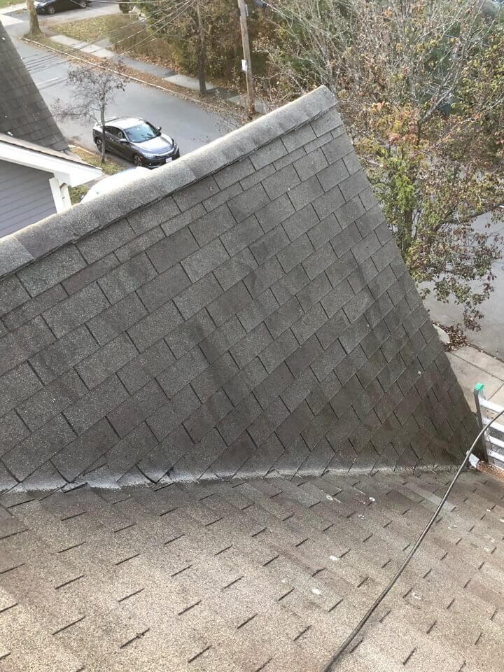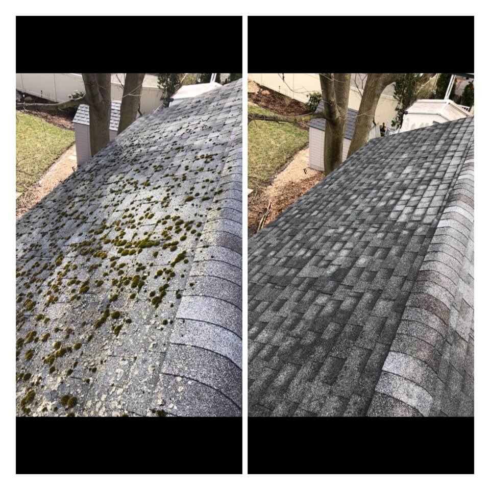 HiCleaners is the most experienced company in Bellingham, MA that deals with roof washing and roof soft washing. All of our employees are trained to recognize precise solution mixing ratios to provide you with the safest and most effective soft washing service. Roofs are a commonly neglected part of a house due to the fact that most people don’t have ladders to access it, so it is very easy to just leave it alone and forget about problems that may start to arise. Just like many home owners, discoloration and small bits of moss on a roof can be overlooked because of the misconception that it is just aesthetic. However, it isn’t just aesthetic, the moss slowly lifts the granules off the shingles which in turn shorten the life of the shingle. The moss also spreads, just like any bacteria if it is left alone for too long, it can quickly become a problem that spirals out of control. Call HiCleaners for a free quote, we only use the most advanced eco-friendly solutions and equipment to make sure the job is done right, for the safety of the employees, your plants, grass, pets, and children.